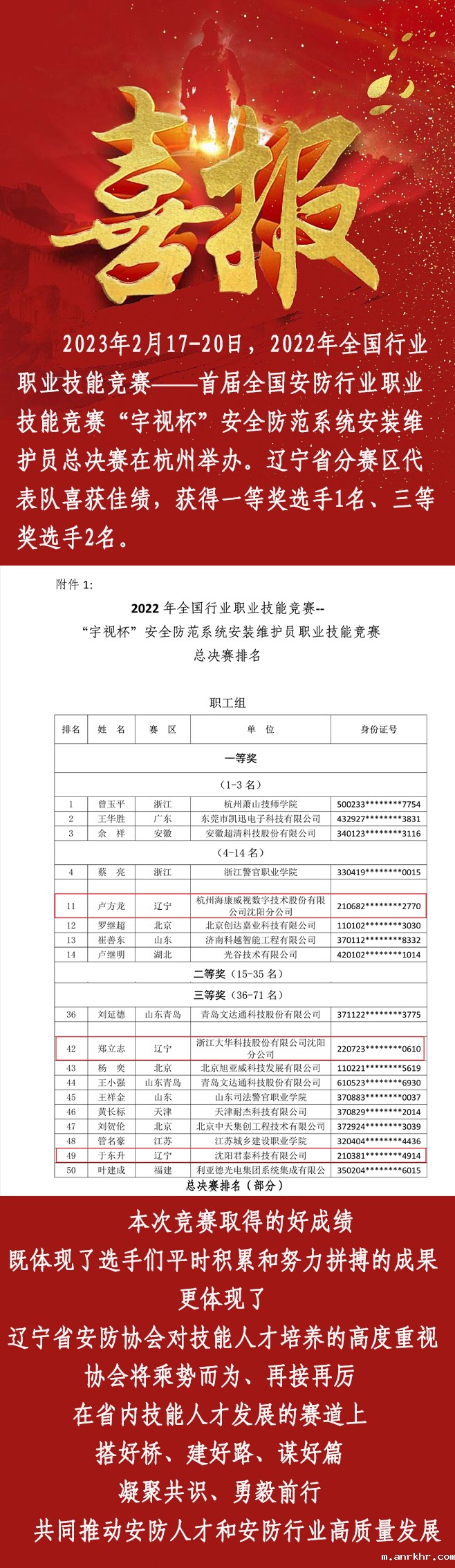 喜讯!!!辽宁省分赛区选手在首届全国安全防范系统安装维护员职业技能竞赛总决赛中喜获佳绩