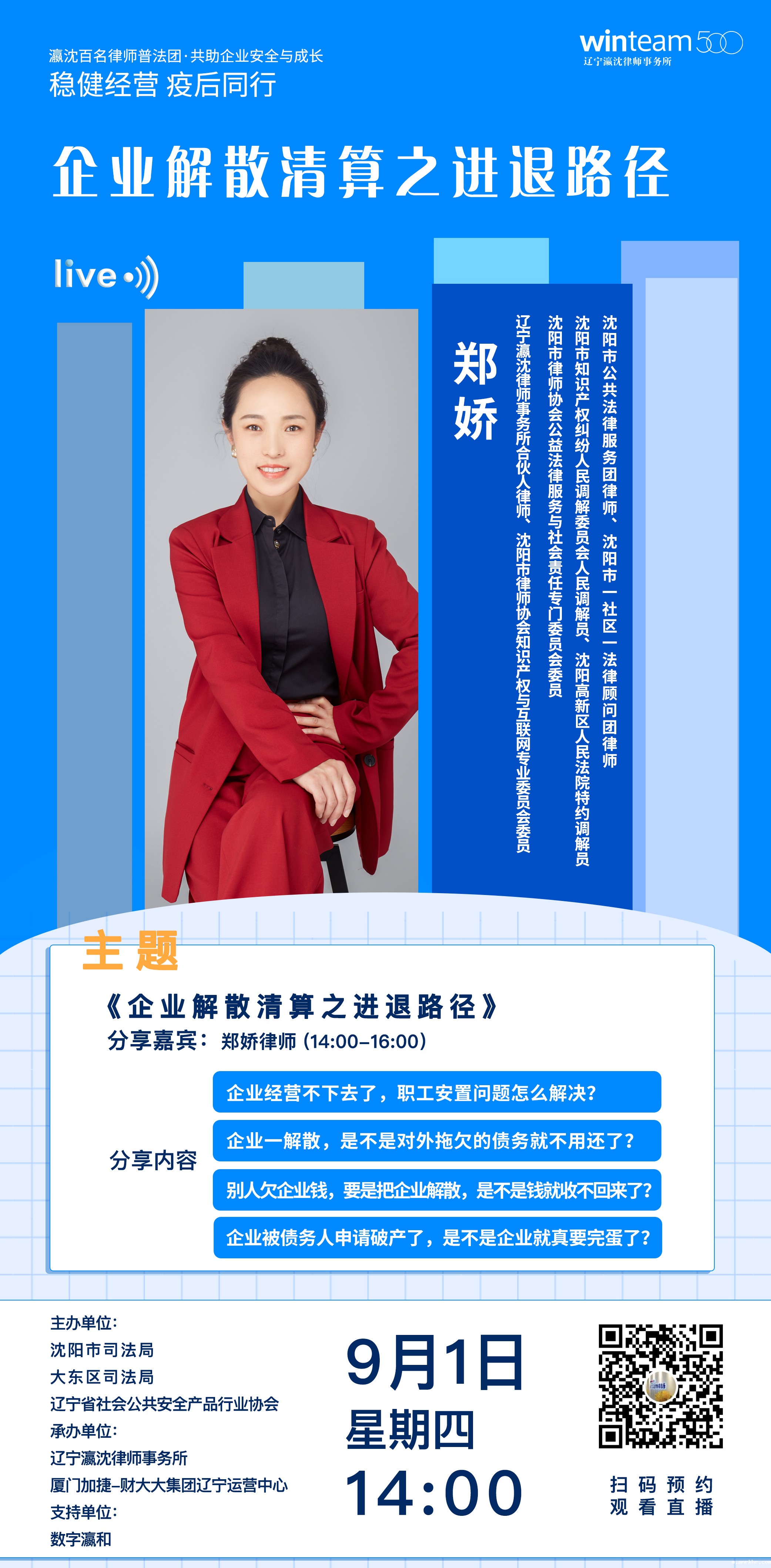 为助力协会成员稳健经营,新利luck全站登录与辽宁瀛沈律师事务所针对企业必掌握的《解散、清算之进退路径》问题,特邀行业资深专家为协会成员进行详细解读!