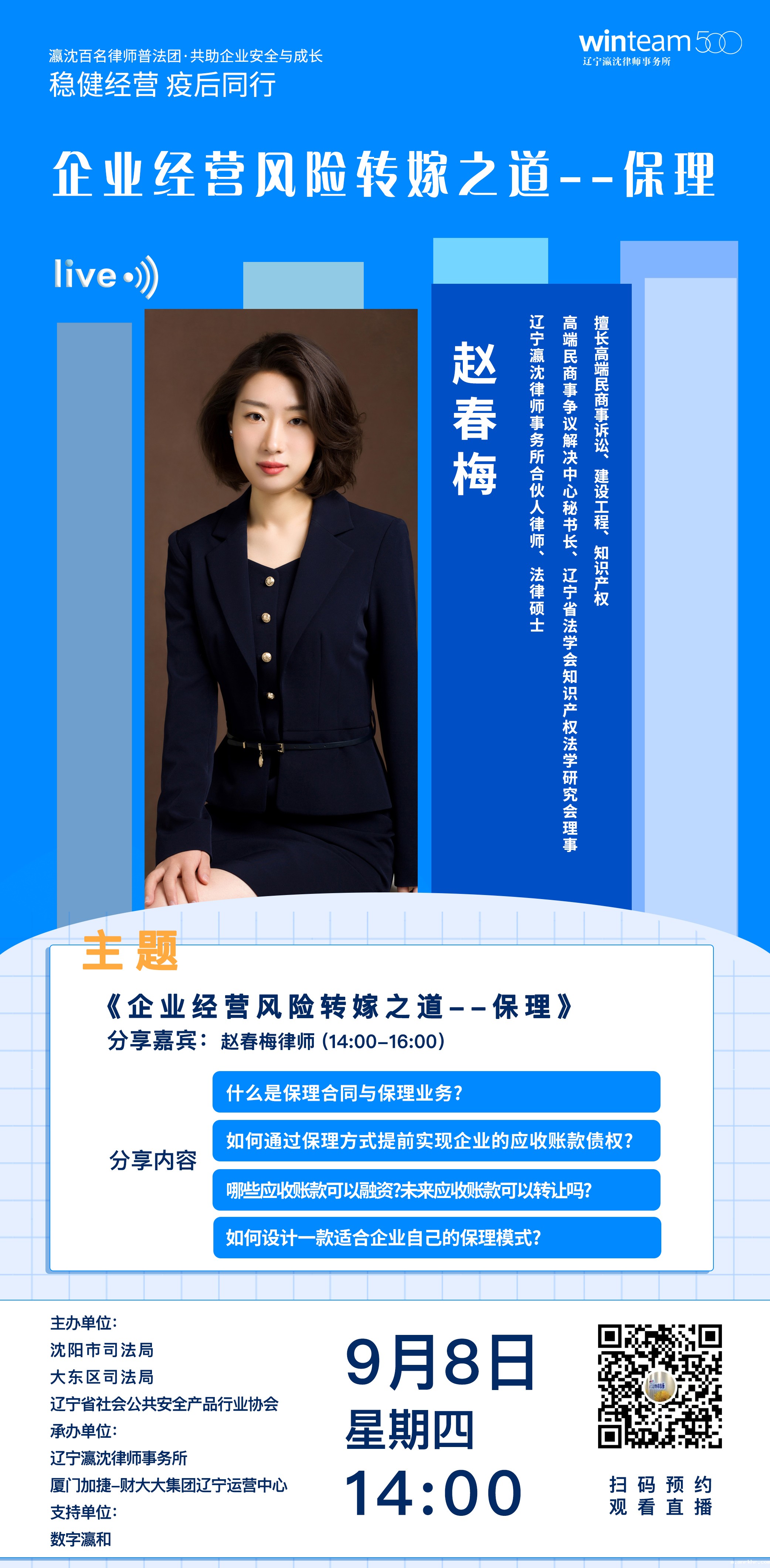 为助力协会成员稳健经营,新利luck全站登录与辽宁瀛沈律师事务所的16支专业化业务团队、上百名律师,针对企业关心的《企业经营风险转嫁之道——保理》问题,特邀行业资深专家为协会成员进行详细解读!