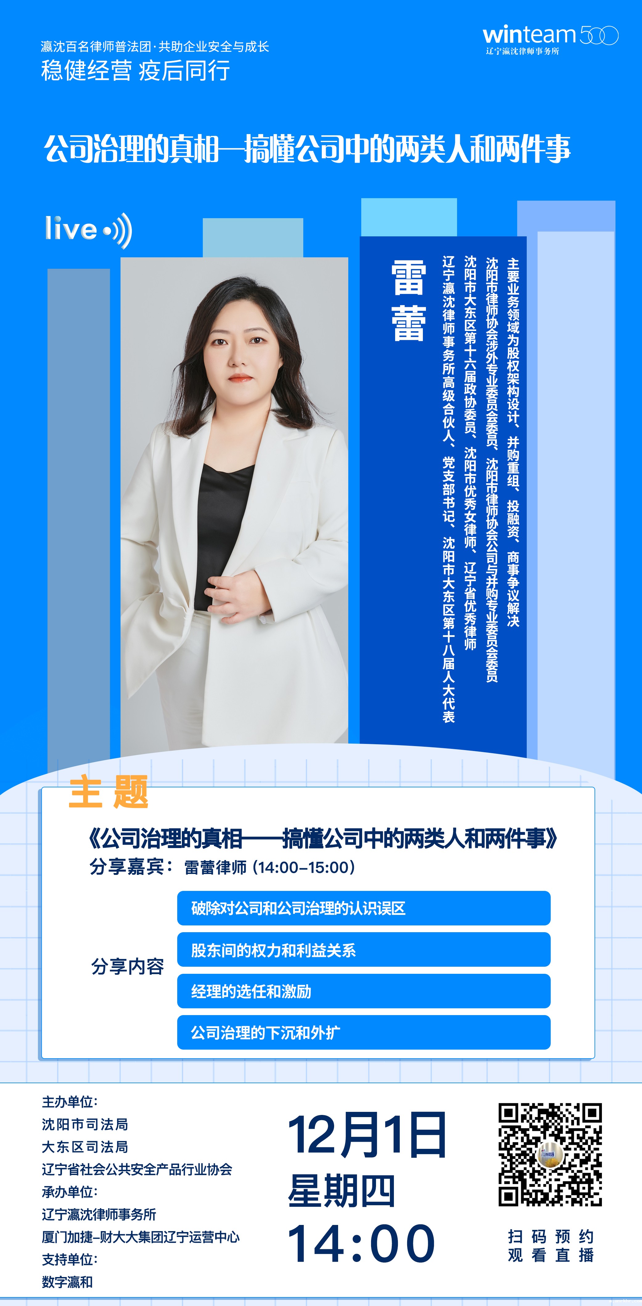 为助力协会成员稳健经营,新利luck全站登录与辽宁瀛沈律师事务所的17支专业化业务团队、上百名律师,针对企业关心的《公司治理的真相——搞懂公司中的两类人和两件事》问题,特邀行业资深专家——雷蕾律师,为协会成员进行详细解读!