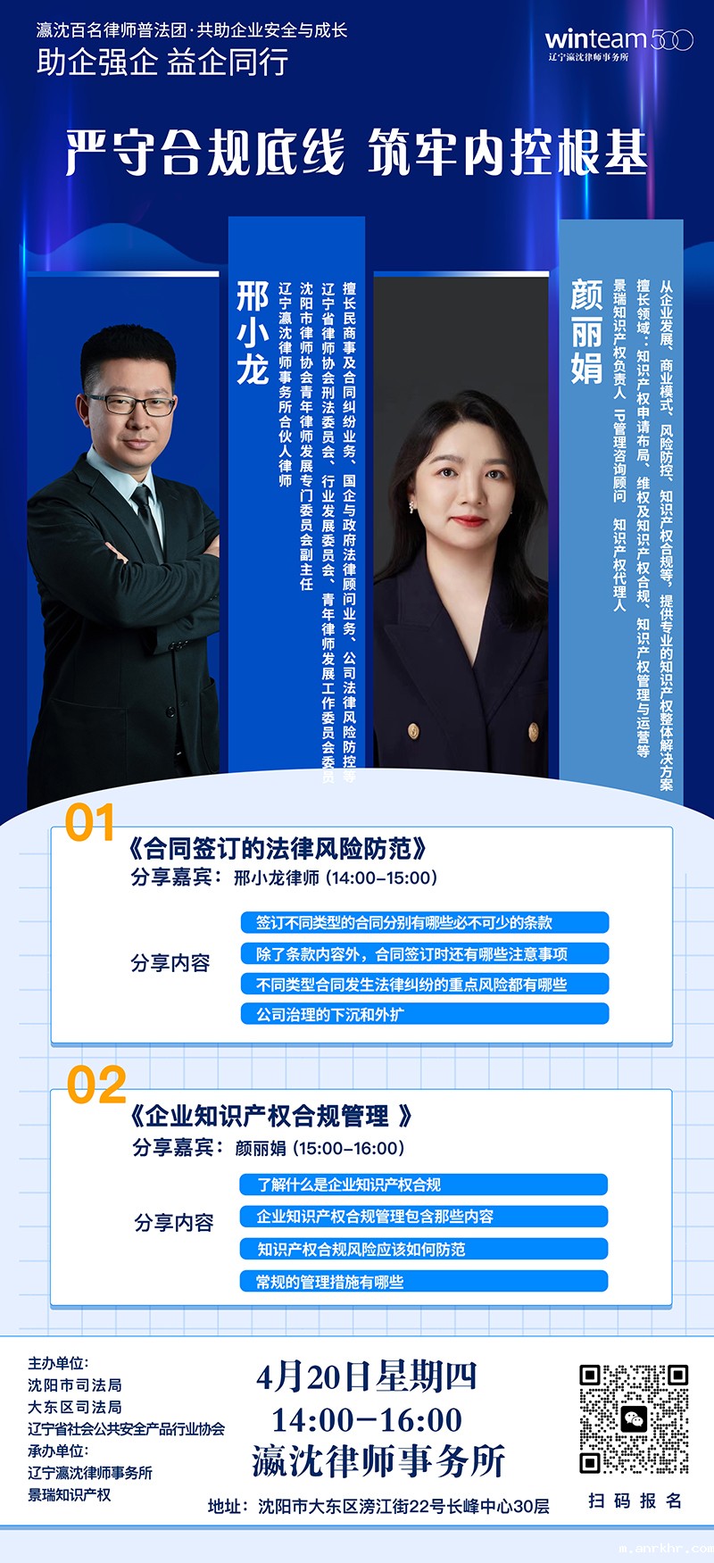 为助力协会成员稳健经营,新利luck全站登录与辽宁瀛沈律师事务所的17支专业化业务团队、上百名律师,针对企业关心的问题,特邀行业专业律师——邢小龙和资深知识产权专家——颜丽娟,为协会成员进行详细解读!