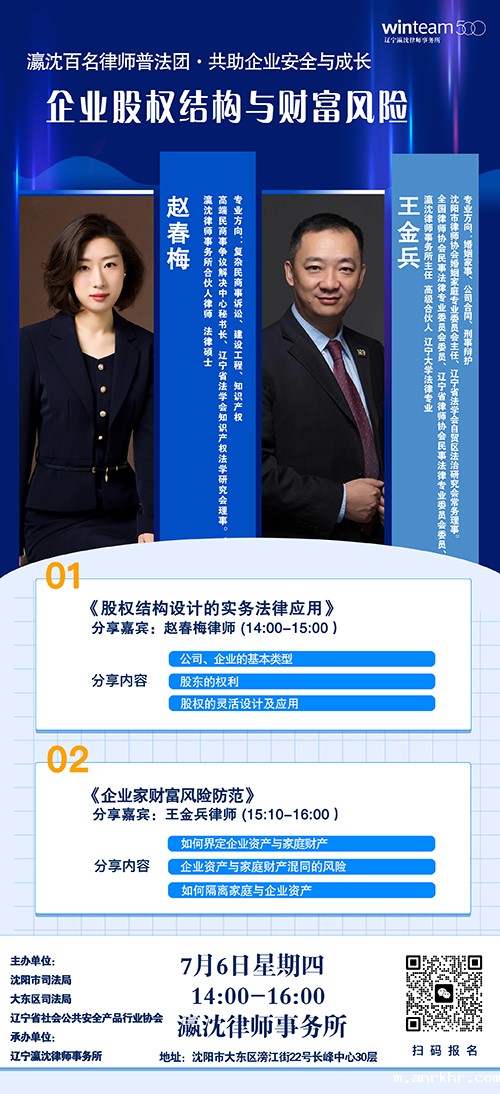 为助力协会成员稳健经营,新利luck全站登录与辽宁瀛沈律师事务所的17支专业化业务团队、上百名律师,针对企业关心的问题,特邀行业专业律师——王金兵律师和赵春梅律师,为协会成员进行详细解读!